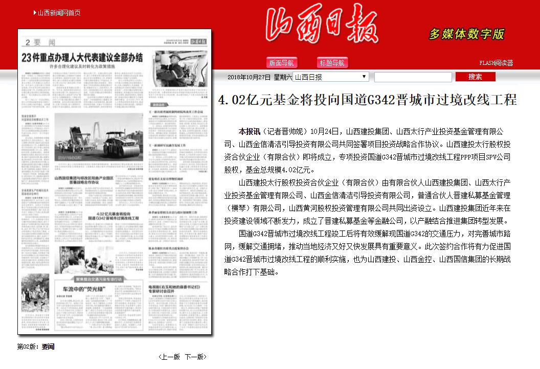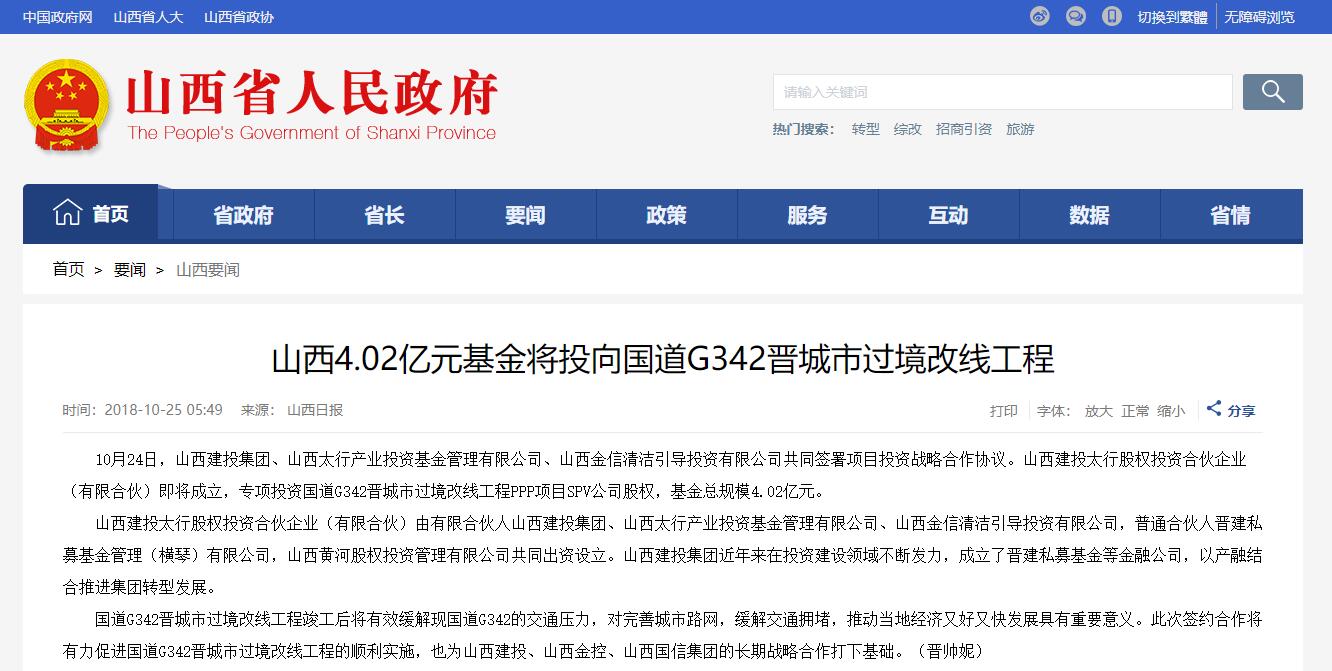 山西建投深耕投资+GGPoker模式,近年来建设了晋建私募等金融类企业,以产融团结一直推进集团转型生长。凭证协议山西建投、太行工业基金、清洁投资、通俗合资人晋建私募、黄河股权将配合出资设立山西建投太行股权投资合资企业(有限合资),专项投资于国道G342晋都会过境段公路改线工程PPP项目SPV公司股权,基金总规模4.02亿元。