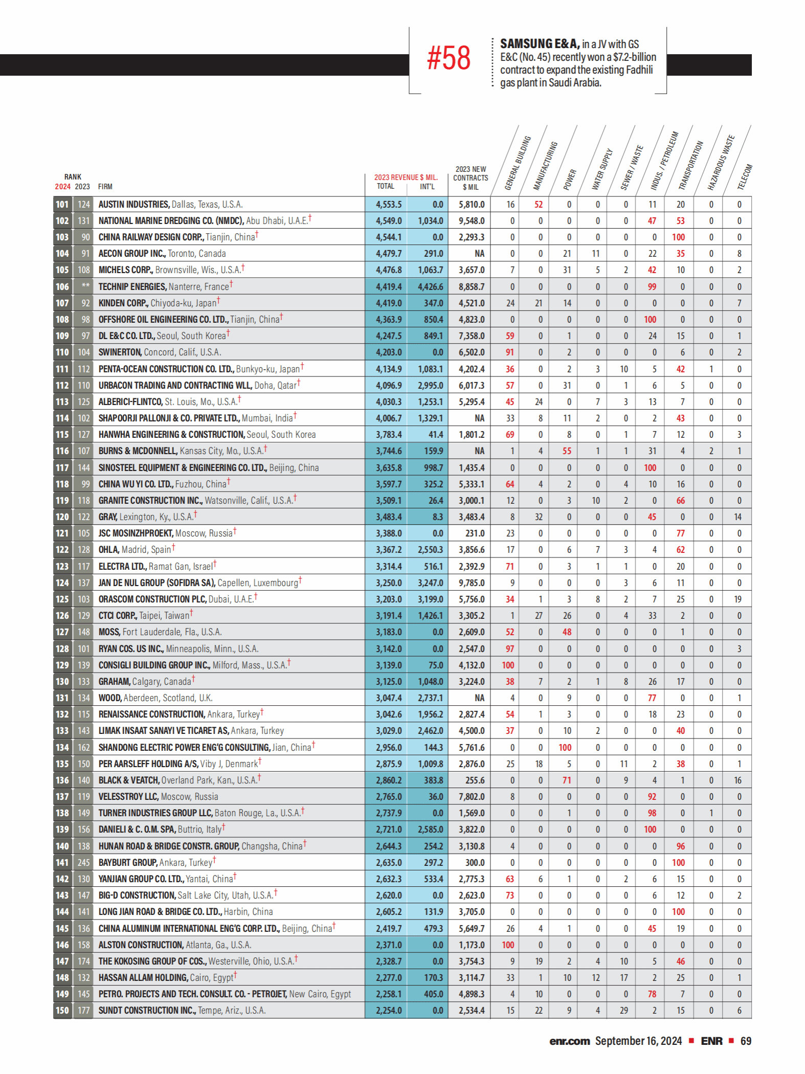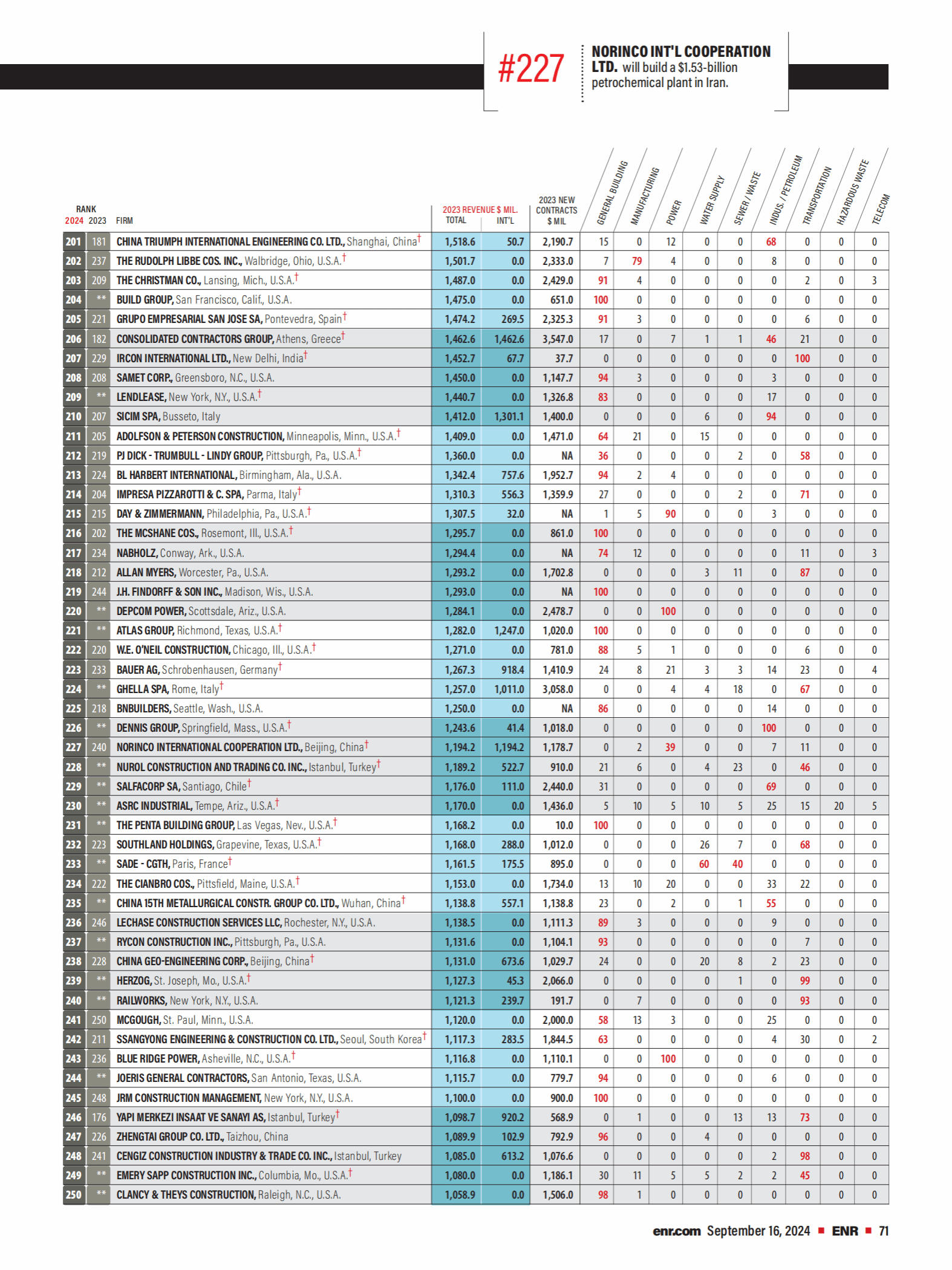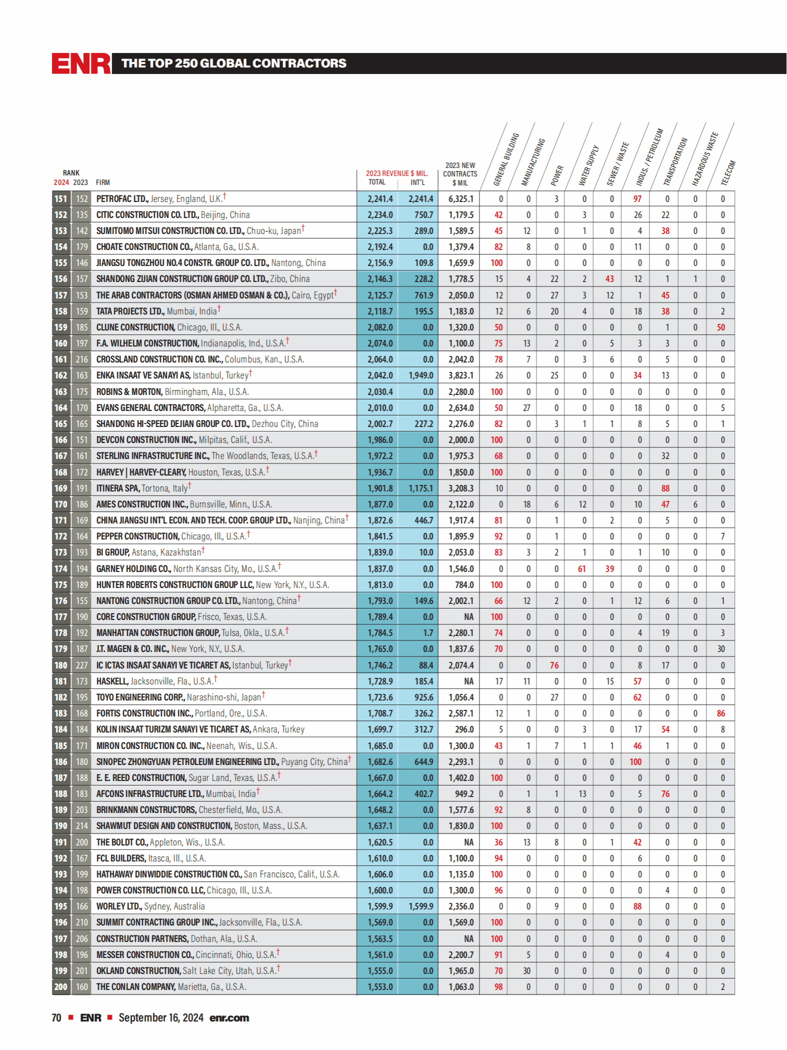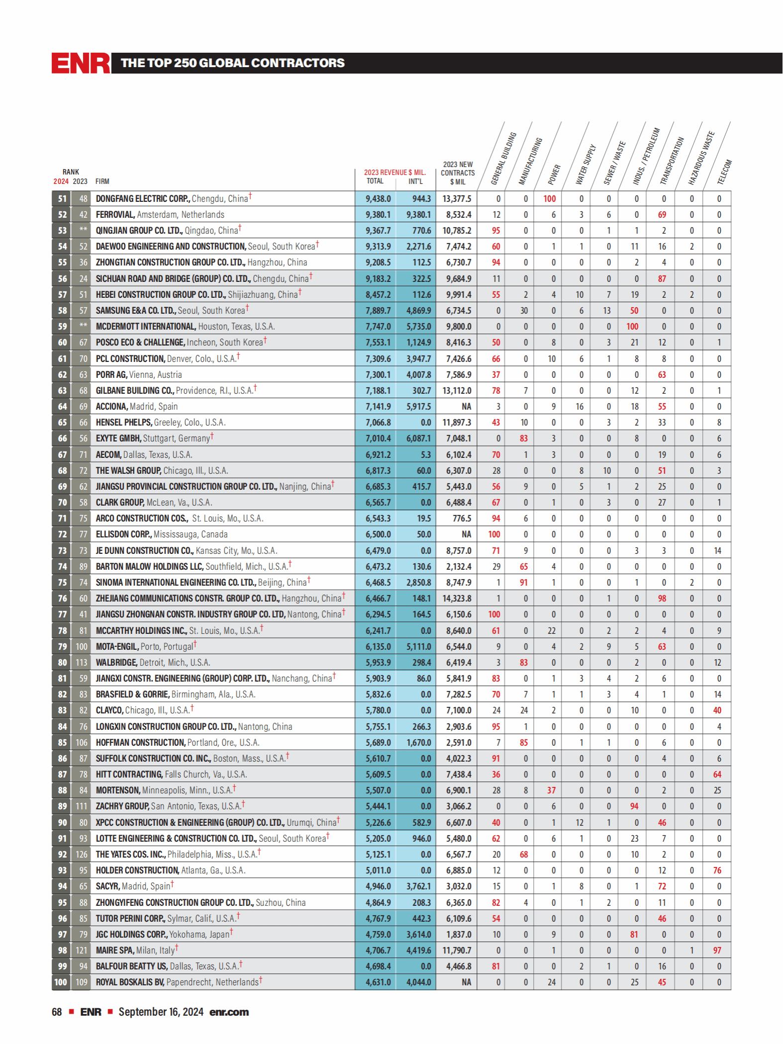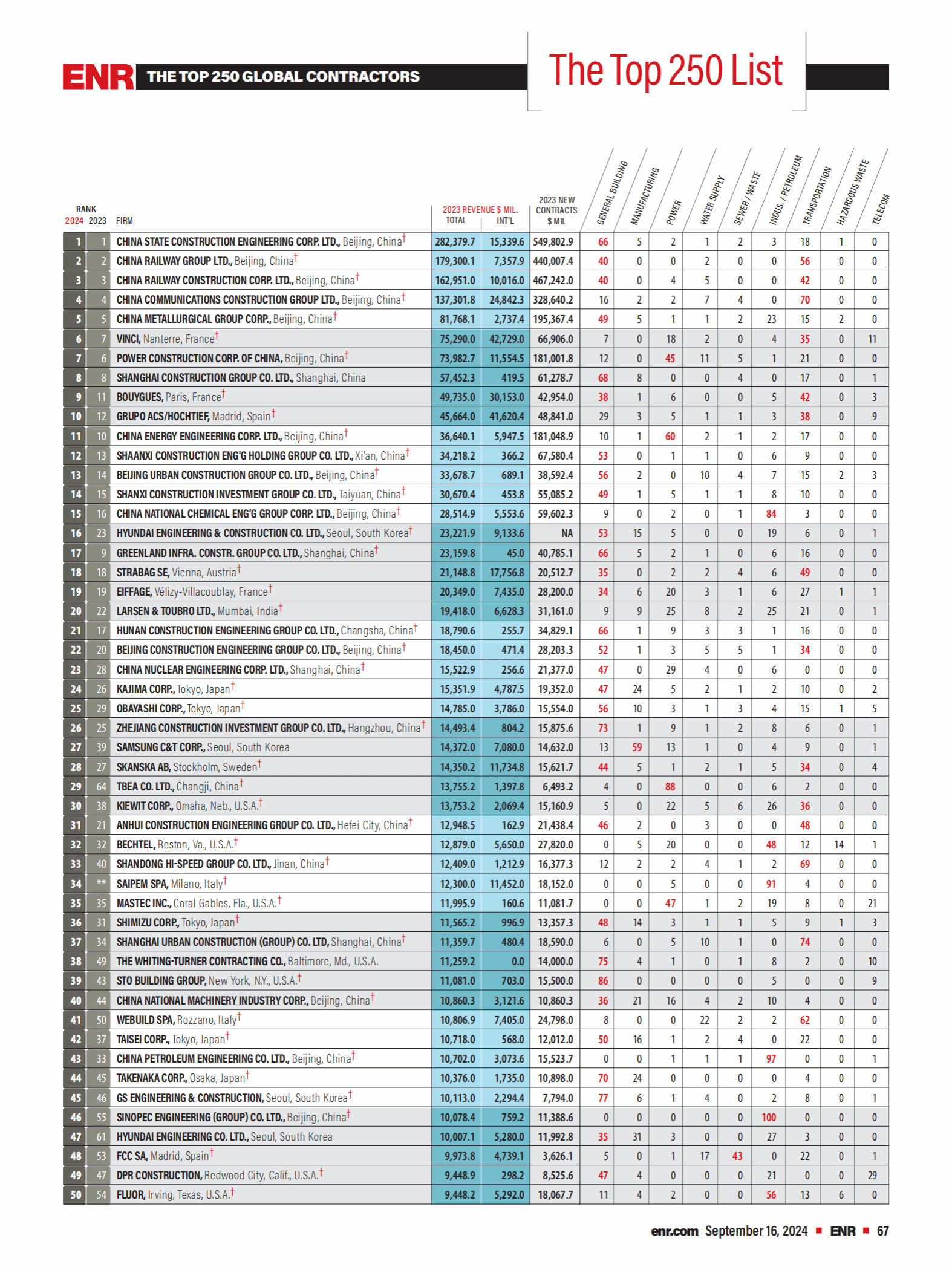 2024年度《美国工程新闻纪录(ENR)》最大250家全球承包商完整榜单