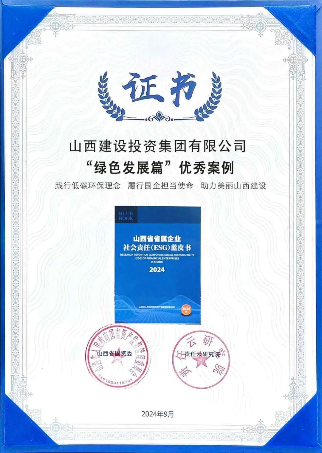 《山西省省属企业社会责任(ESG)蓝皮书(2024)》收录了60篇省属企业优异案例,全方位、多条理展示了省属企业的履责行动与效果。其中,建投集团《以高质量党建引领高质量生长》《推行国企责任 精准服务民生 共筑优美生涯》《国企继续 数字制作 蹚出转型生长新路径》《践行低碳环保理念 推行国企继续使命 助力漂亮山西GGPoker》等4个社会责任案例入选《山西省省属企业社会责任(ESG)蓝皮书》,并荣获“绿色生长篇”和ESG优异案例表扬。