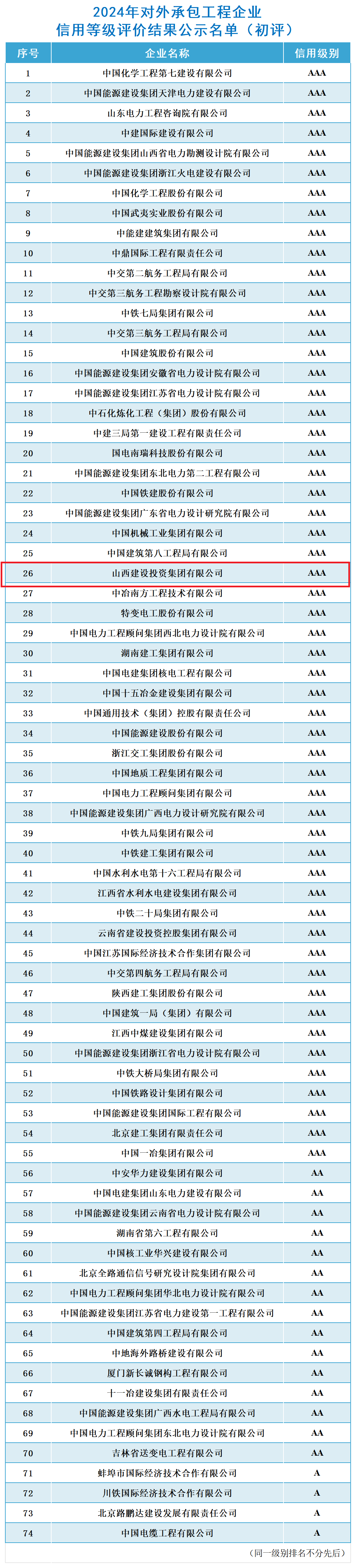 克日,2024年中国对外承包工程商会企业信用品级评价效果宣布,山西建投集团顺遂通过对外承包工程AAA级信用企业初评(期满重评),一连第七年被评为最高信用品级AAA级企业。