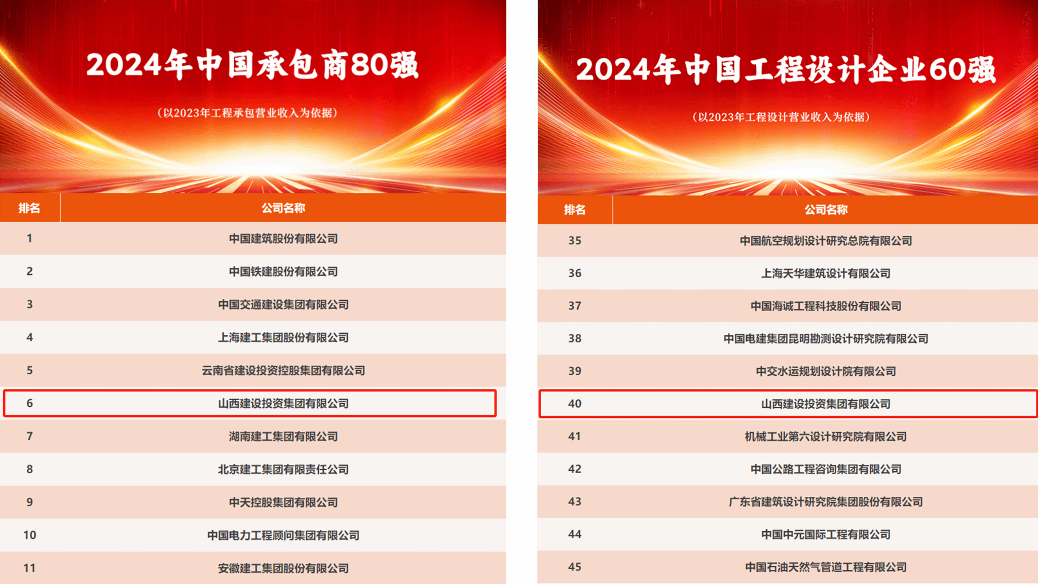 12月9日,美国《工程新闻纪录》(ENR)和中国《修建时报》配合宣布了2024年度中国承包商80强和工程设计企业60强榜单,山西建投集团位列中国承包商80强第6名,较2023年上升1位;工程设计企业60强第40名。