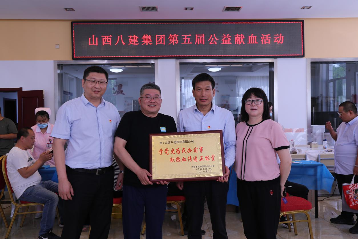 太原市血液中心副主任周源向八建集团多年来对无偿献血公益事业的鼎力大举支持和献血自愿者们的无私贡献体现由衷赞赏和衷心谢谢,将题有“学党史为民办实事,献热血转达正能量”的牌匾赠予集团。