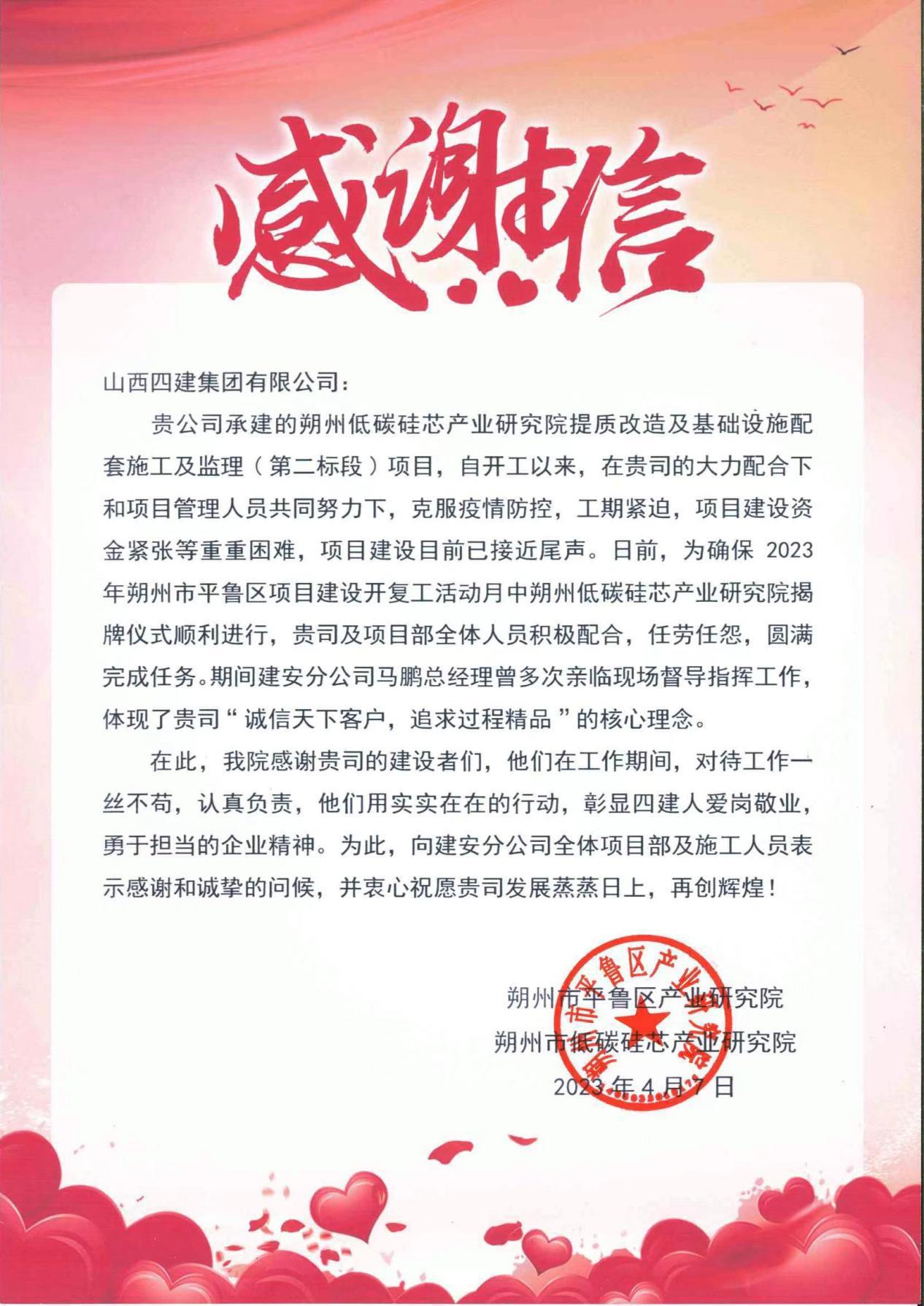 来自朔州市平鲁区工业研究院和朔州市低碳硅芯工业研究院的谢谢信