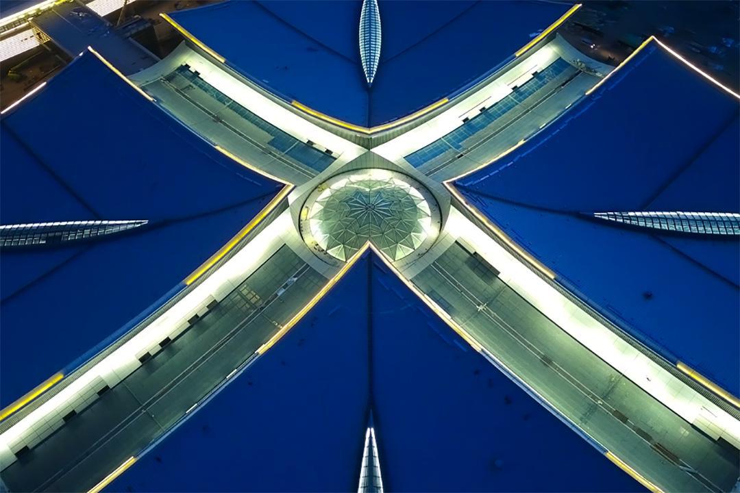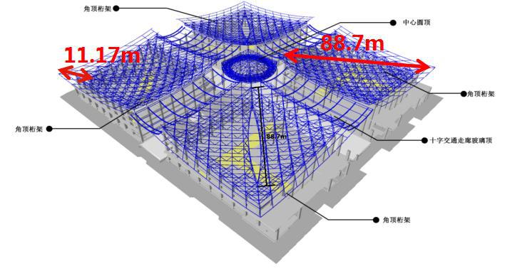 项目总体工程量大、施工面积大、高空作业量较大,桁架拼装施工阶段工期主要、施工周期短,钢结构工程施工工艺重大,施工历程中与土建专业、围护结构施工交织作业较为频仍。屋盖结构是该项目最为重大部分,属于非一连的大跨度正交斜放空间管桁架结构,分四个角顶、十字交通走廊玻璃顶、中心圆顶三部分,四个角顶每个投影面积约6400平方米,重量1000余吨,最大跨度88.7米,最大高空作业高度约36米,为典范的超高峻跨度施工。桁架结构中,各个角顶均为非对称桁架、四边不等高造型,杆件数目多达2万根,其中单个节点最多需将14根杆件交汇焊接,制作、施工难度系数高。