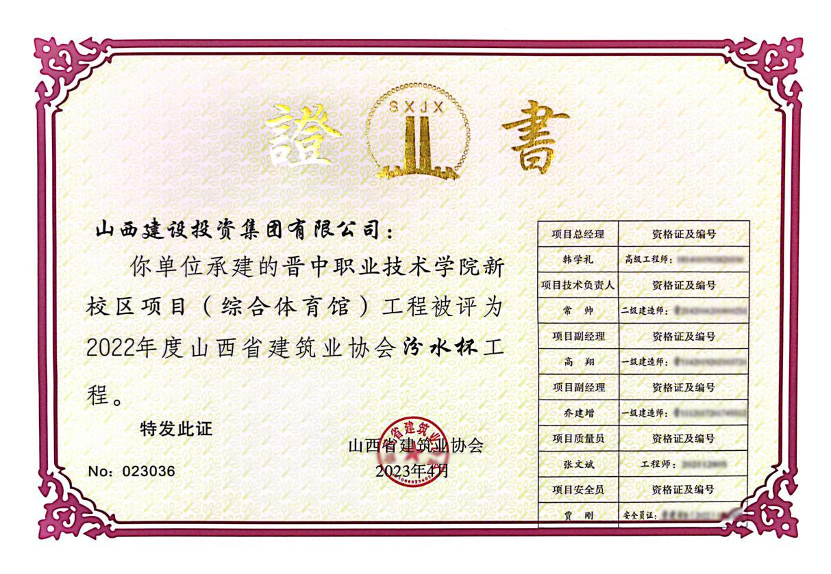 克日 ,山西省修建业协会宣布2022年度及2021年度(省外工程)山西省修建业协会汾水杯工程评价名单。总承包公司承建的晋中职业手艺学院新校区项目公共教学楼主楼及学生事务中心、综合体育馆两项工程获此殊荣。