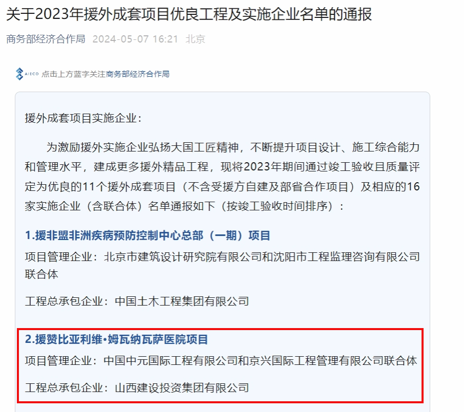 克日,商务部国际经济相助事务局宣布2023年援外成套项目优良工程及实验企业转达表扬名单 。由山西建投国际GGPoker集团实验的援赞比亚利维·姆瓦纳瓦萨医院项目,被商务部授予“援外成套项目优良工程” 。