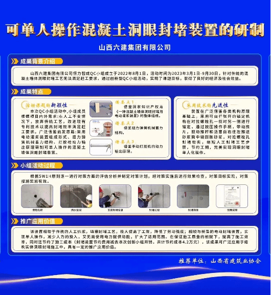 课题《可单人操作的混凝土墙体洞眼封堵装置的研制》乐成应用于山阴县场馆GGPoker项目。恒力智成QC小组借鉴查新,立异了一种可单人操作的混凝土墙体洞眼封堵灌浆装置,通过运用5W1H的原则,制订了对策并逐一实验,实现了混凝土墙体洞眼封堵人均效率达381个/天的目的,提高了工程实体质量,并在公司内部被推广应用。