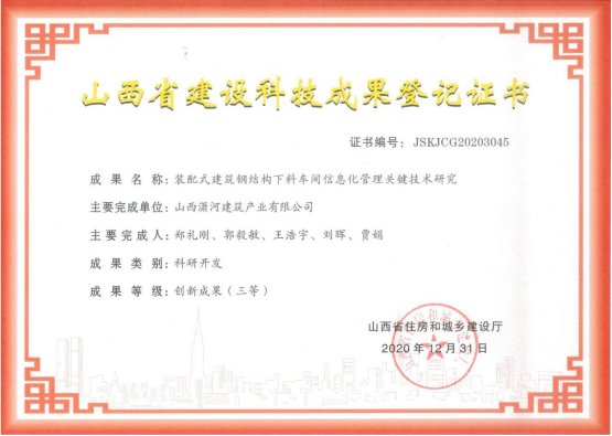装配式修建钢结构下料车间信息化治理要害手艺研究科技效果挂号证书